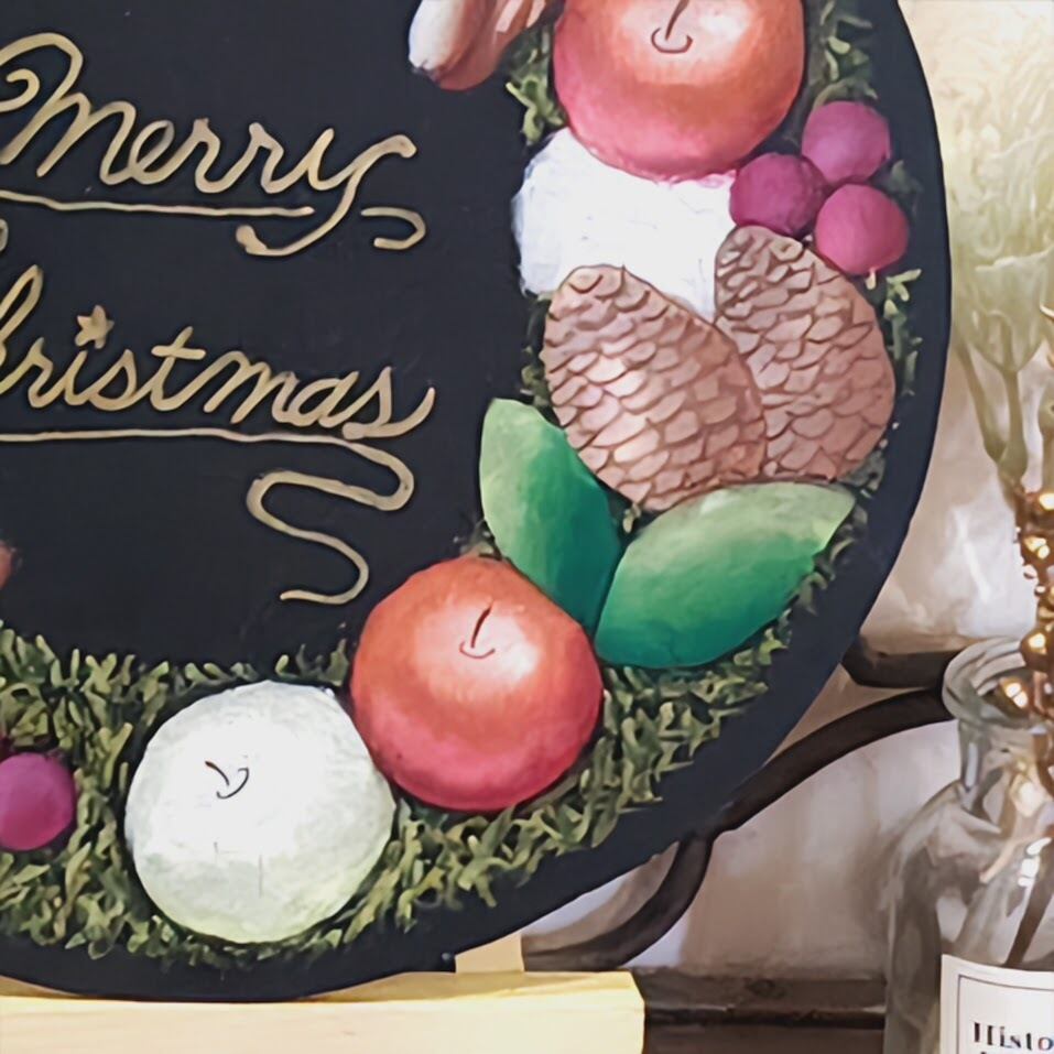黒いボードに映える深いグリーンと赤い実、やさしい灯りを思わせる色合いが、お部屋にほっとするようなクリスマスの空気を運んでくれます。可愛らしさがありながらも落ち着いた印象なので、玄関やリビングはもちろん、季節のディスプレイとしても飾りやすい一枚です。