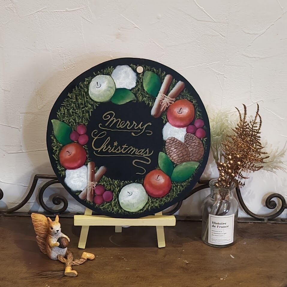 りんごや木の実、キャンドル、シナモンをリースのように描いた、ナチュラルであたたかな雰囲気のクリスマスチョークアートリースボードです。