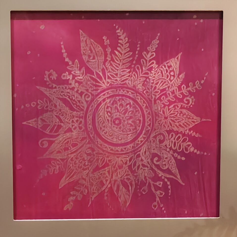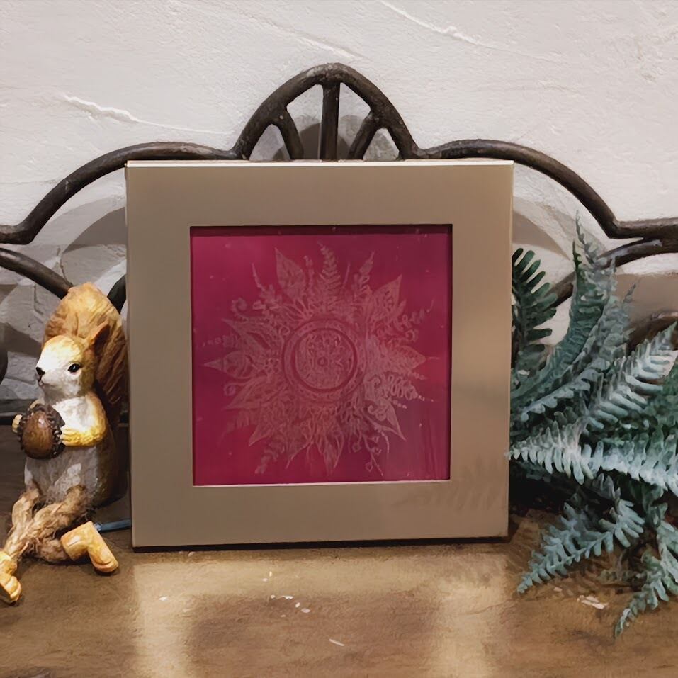 こちらの作品は、目を惹く鮮やかな赤を背景に、繊細な曼荼羅模様を丁寧に描いた一枚。