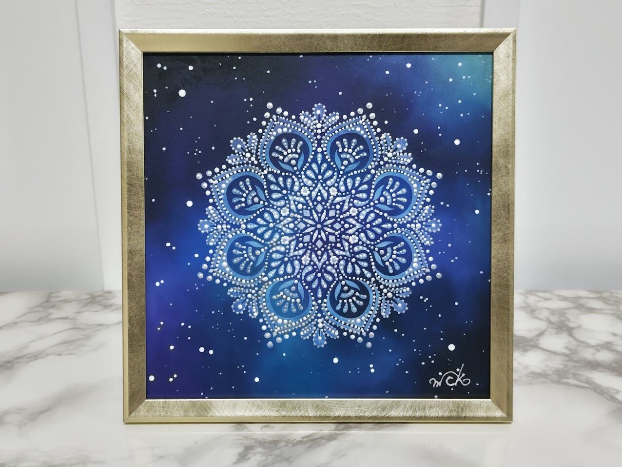 深い青の世界に、雪の結晶のような曼荼羅が静かに浮かび上がる一点物のアート作品です。