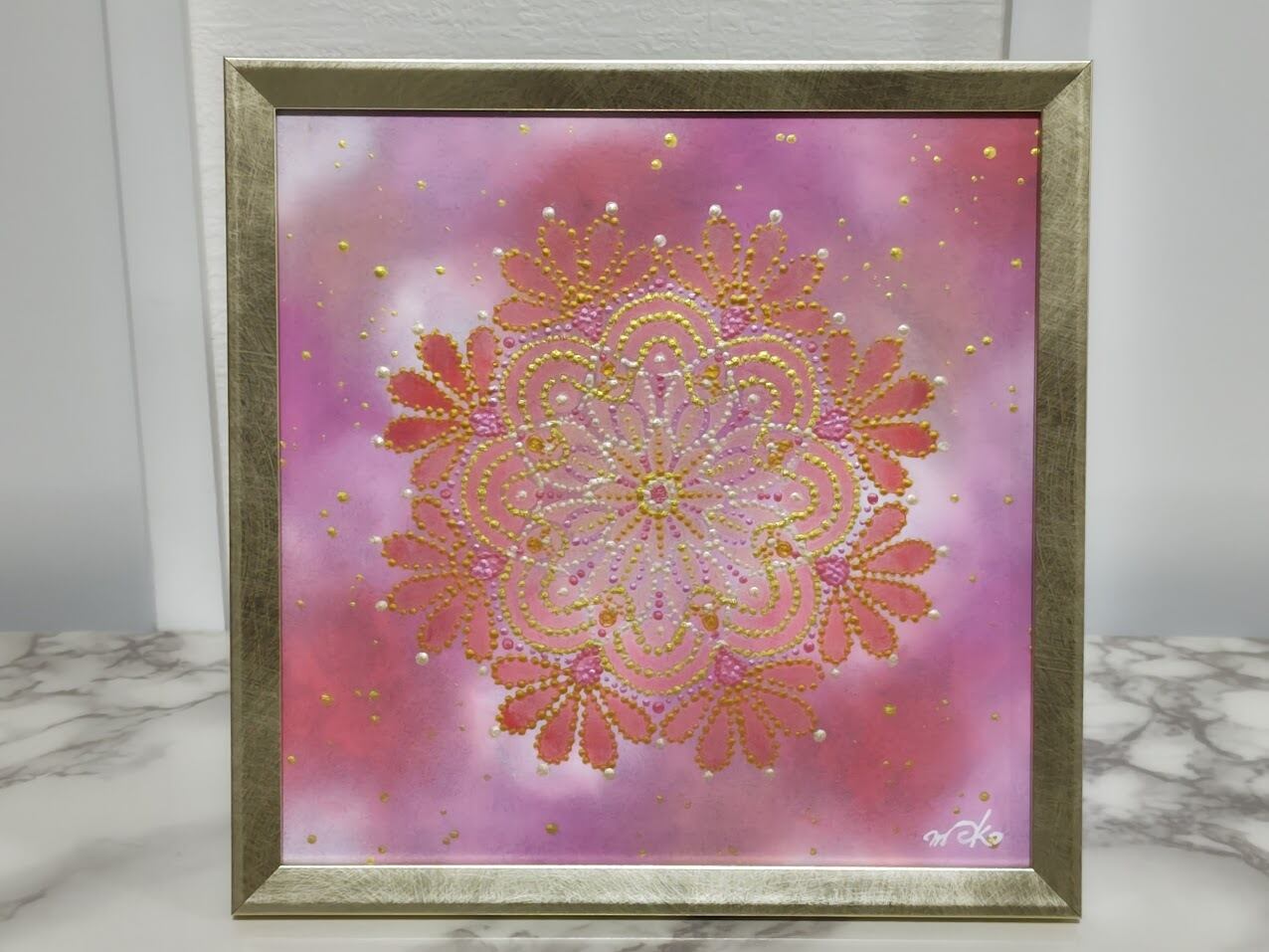 この作品は、淡いピンクからローズカラーへとにじむように重なる背景に、ゴールドやパール調の彩りを丁寧に重ねて描き上げました。ふんわりとした色合いの中に、華やかさと優しさが同居し、見ているだけで気持ちまでやわらぐような一枚です。