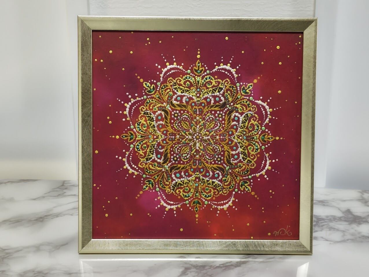 情熱的な赤の背景に、繊細で華やかな曼荼羅模様を丁寧に重ねた一点物のアート作品です。