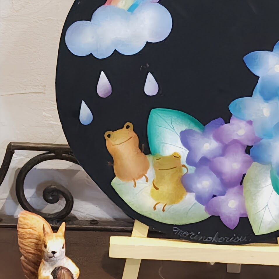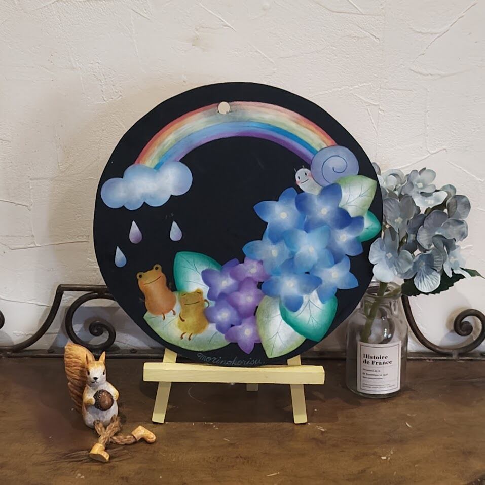 黒いボードに映える虹のやわらかな色合いと、しっとり咲くあじさいの青や紫が、お部屋にやさしい季節感を運んでくれます。小さなかえるや雨粒が可愛らしいアクセントになっていて、見ているだけで気持ちがほっとやわらぐ一枚です。