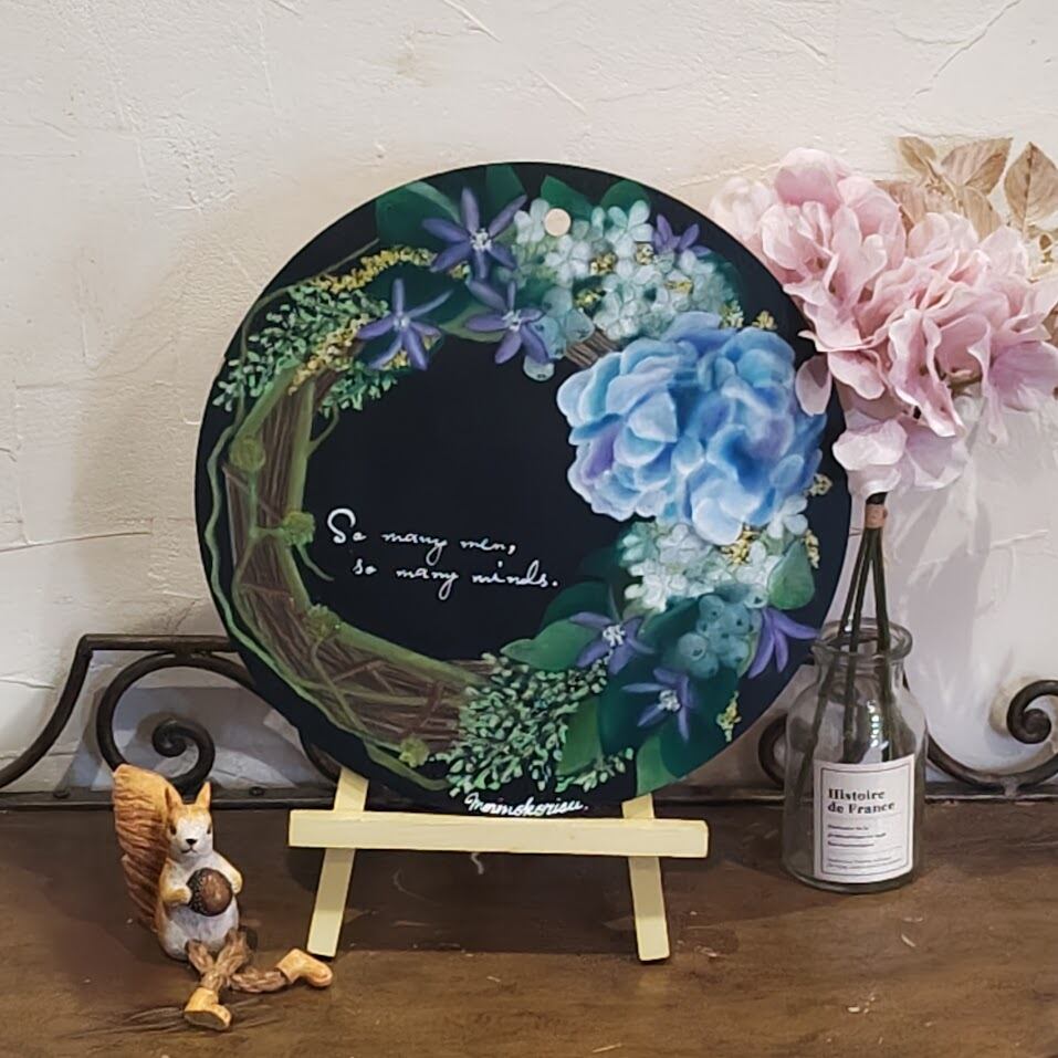 しっとりと咲く紫陽花を飾る、手描きのチョークアートリースボード