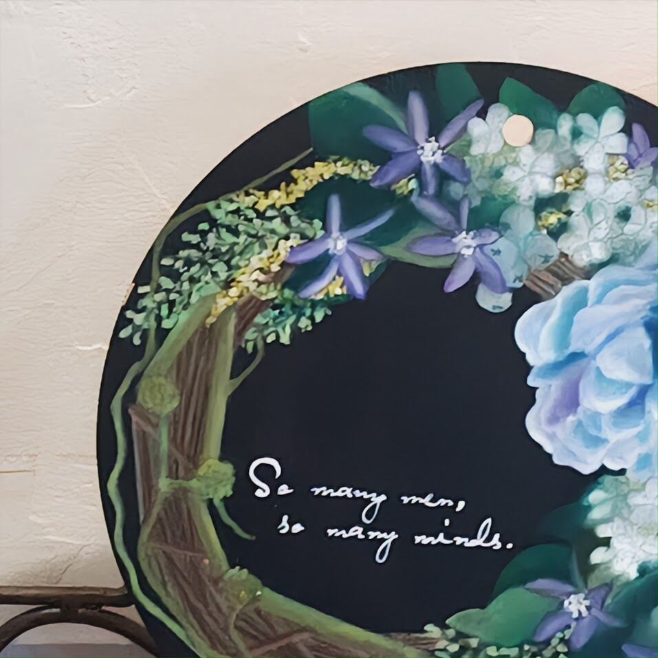 みずみずしい紫陽花と可憐な草花をリースのように描いた、上品でやさしい雰囲気のチョークアートリースボードです。