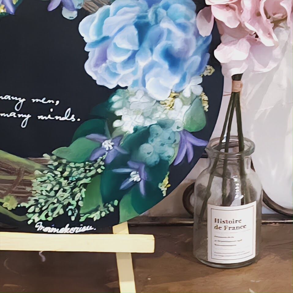 黒いボードに映える紫陽花の青や紫、瑞々しいグリーンが、お部屋にしっとりとした季節の彩りを添えてくれます。落ち着いた華やかさがあるので、玄関やリビングはもちろん、静かで心地よい空間を作りたい場所にもおすすめです。