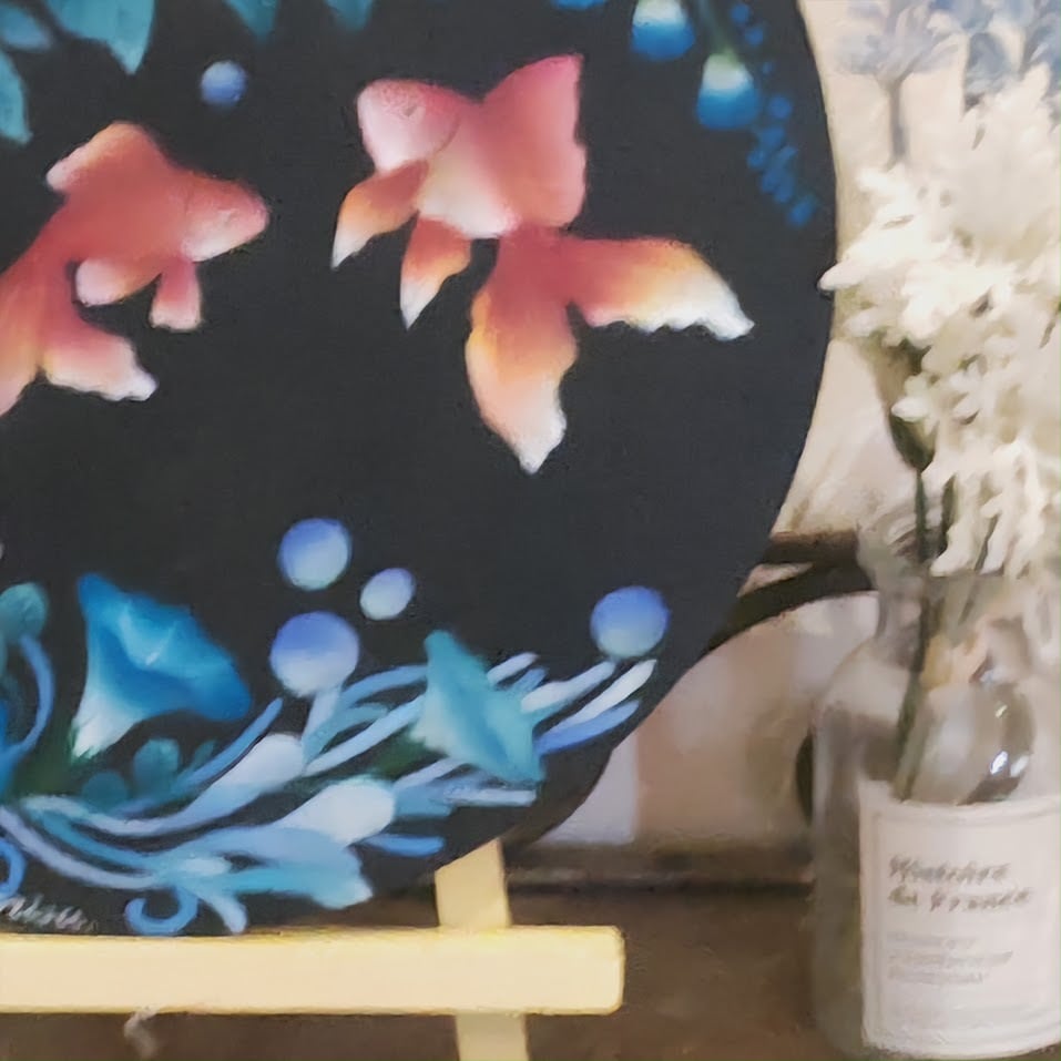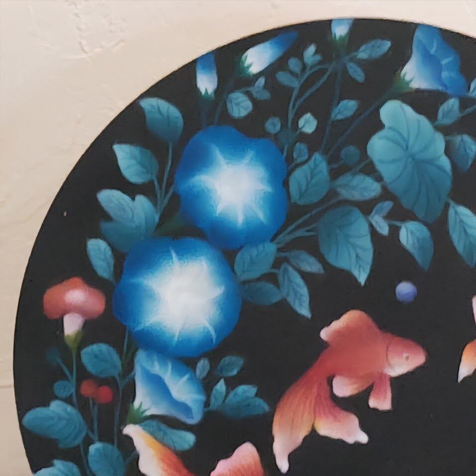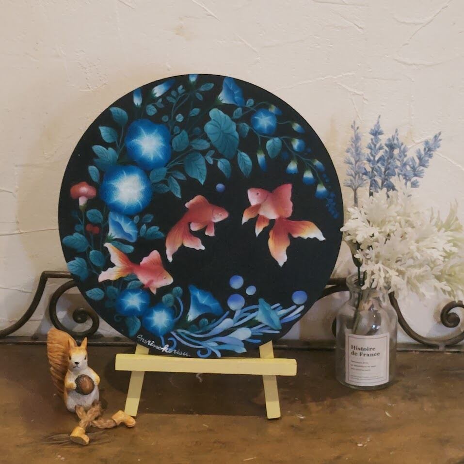黒いボードに映える鮮やかな青の朝顔と、ふんわりとやわらかな色合いの金魚が、お部屋にすっと涼しげな季節感を運んでくれます。華やかさがありながらも落ち着いた印象なので、玄関やリビングはもちろん、夏のインテリアを上品に楽しみたい方にもおすすめです。